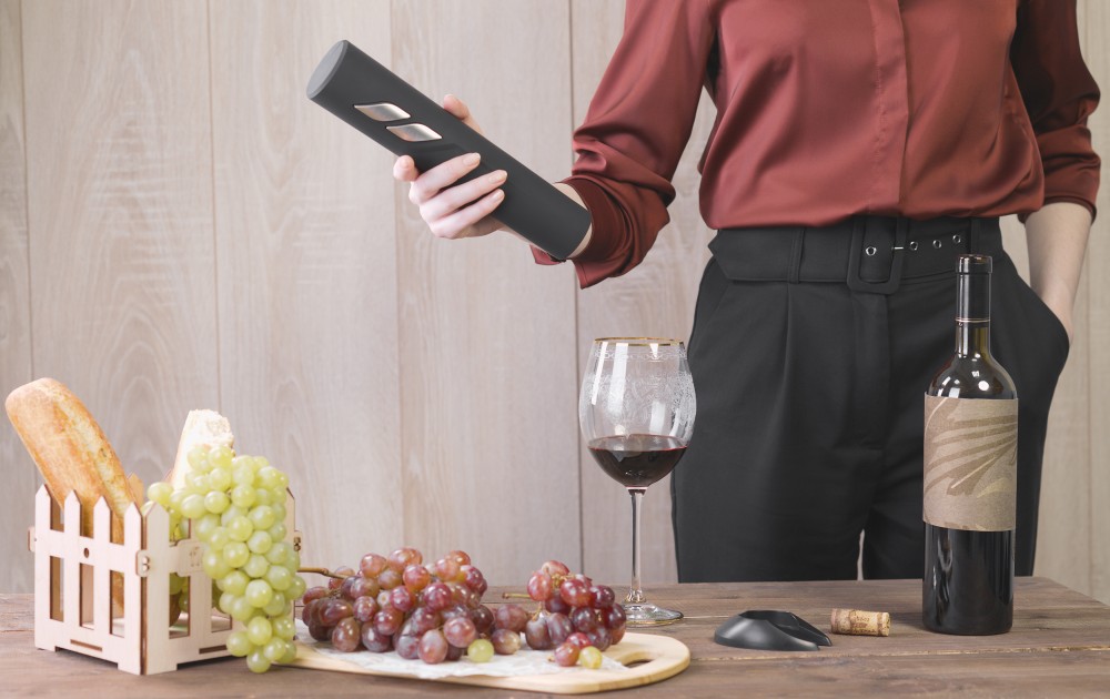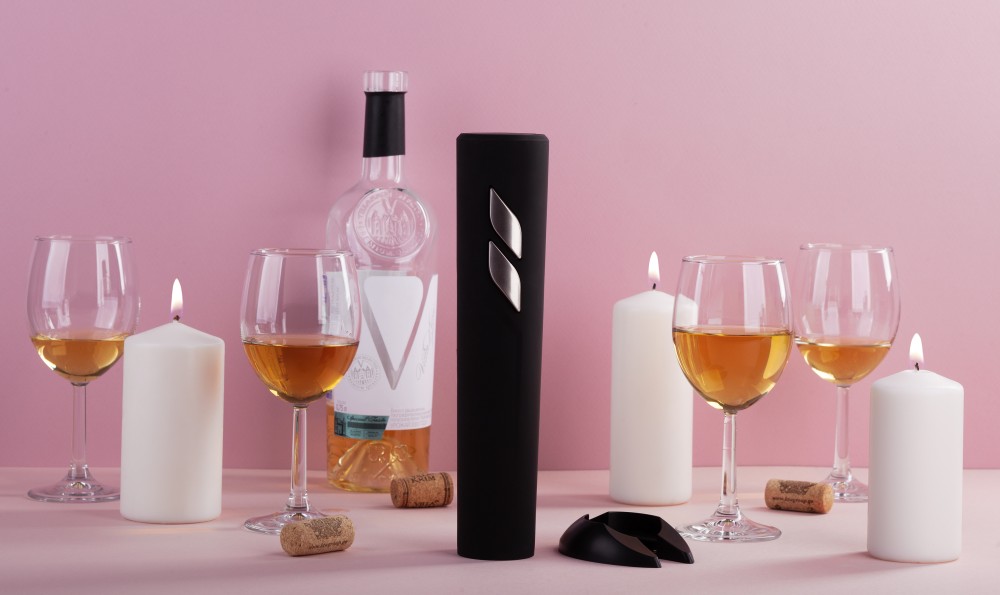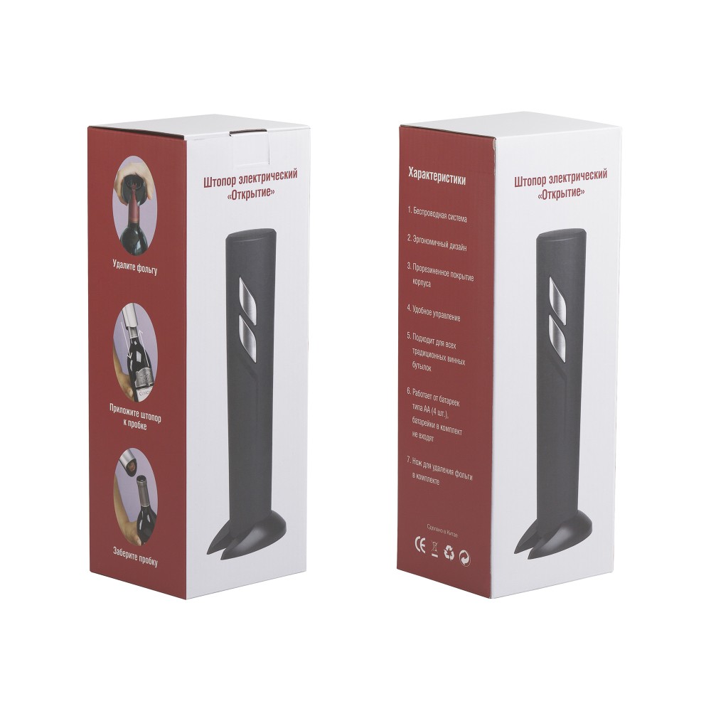 Электрический штопор «Открытие» отличается стильным оформлением, простым и удобным механизмом для безопасного извлечения пробок из бутылок. В комплект входит нож для обрезания фольги. 20 секунд необходимо чтобы открыть бутылку, достаточно установить штопор поверх бутылки и при помощи нажатия на нижнюю кнопку «загнать» спираль в пробку, после — нажать верхнюю кнопку, чтобы извлечь пробку из спирали. Аксессуар станет практичным гаджетом на Вашей кухне и полезным подарком для любителей благородных напитков.