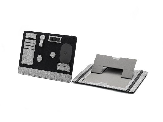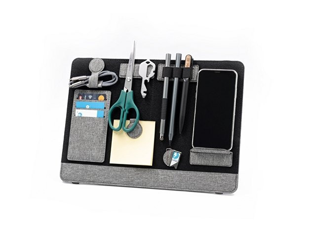«Clipboard Pro», который одновременно служит подставкой для ноутбука и настольным органайзером, является идеальным корпоративным подарком. В «Clipboard Pro» встроена складная подставка для ноутбука, что позволяет создать эргономичное рабочее пространство в любом месте! Помимо подставки для ноутбука, этот настольный органайзер оснащен подставкой для телефона с быстрой беспроводной зарядкой мощностью 15 Вт (регулируемой), планшетом для обмена, двумя магнитными док-станциями, держателем для ручек, держателем для карт, зажимом для кабеля и подставкой для телефона. Поддерживать порядок на рабочем столе еще никогда не было так просто! Этот универсальный ремень крепится к ноутбуку, как эластичная закладка.