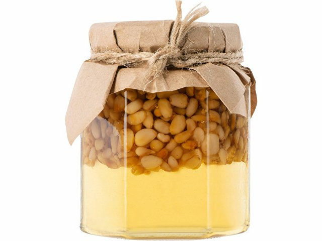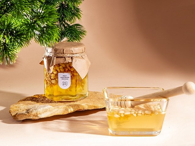 Мед и орехи прекрасно сочетаются друг с другом, образуя оригинальный и запоминающийся вкус. Медовый десерт с кедровыми орешками, не только вкусный, но и полезный, идеально подойдет для чаепития, поэтому подобный подарок можно также дополнить чаем. Так как продукт состоит из натуральных ингредиентов, возможно его засахаривание