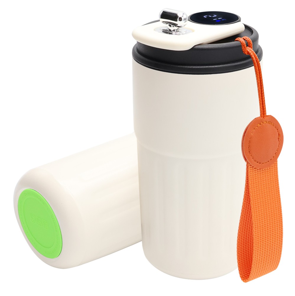 Термокружка Ashly с дисплеем выполнена из пищевой нержавеющей стали. Объем 400 мл. Имеет двойные стенки с вакуумной изоляцией, крышка изготовлена из пищевого безопасного для человека пластика. Особенностью термокружки Ashly является наличие сенсорного индикатора температуры, расположенного в крышке. Чтобы узнать температуру напитка внутри кружки, достаточно прикоснуться к поверхности крышки. Помимо этого, термокружка Ashly очень удобна в использовании. Просто нажмите на клапан в направлении дисплея, чтобы открыть верхнюю часть крышки и насладиться любимым напитком. Элегантный дизайн, удобство и функциональность - вот что делает термокружку Ashly незаменимым аксессуаром для всех любителей горячих и холодных напитков. В комплекте: шнурок, силиконовая накладка и фирменная коробка. Надежная крышка - качественные и безопасные материалы - двойные стенки из нержавеющей стали - сенсорный ЖК-дисплей - информация о температуре жидкости -отличные теплоизоляционные свойства - эргономичный дизайн - удобная форма! Термокружка подходит для большинства автомобильных подстаканников. Цвет шнурка, максимально близкий к пантону 165С, цвет накладки максимально близкий к пантону 7487С.