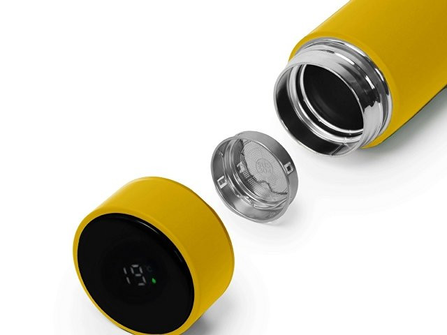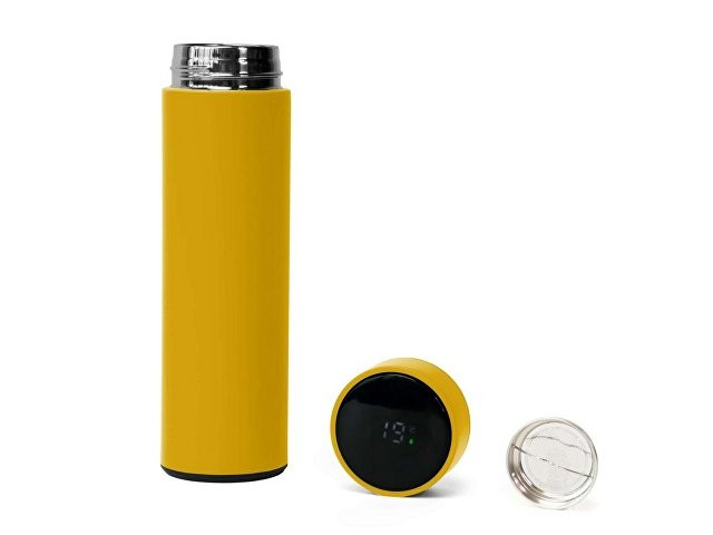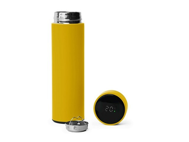 Расчет нанесенияТермос из нержавеющей стали, покрытый цветным soft touch, с крышкой, в которой встроен термометр и LED дисплей, показывающий температуру внутри термоса. Объем: 500 мл. Упаковка: каждый термос в крафт коробке.