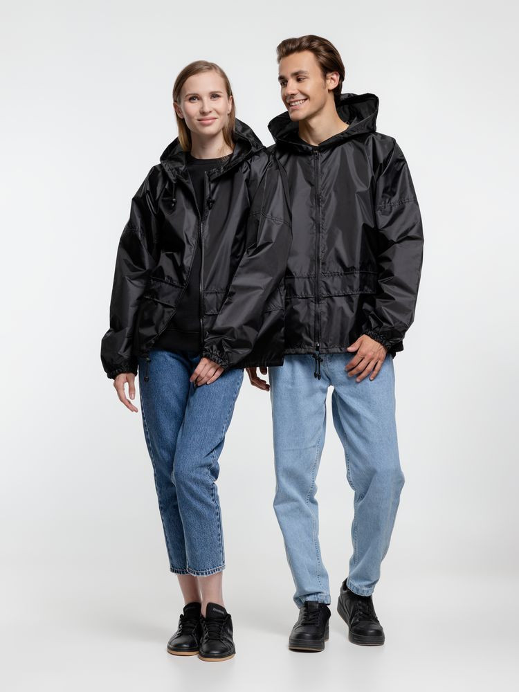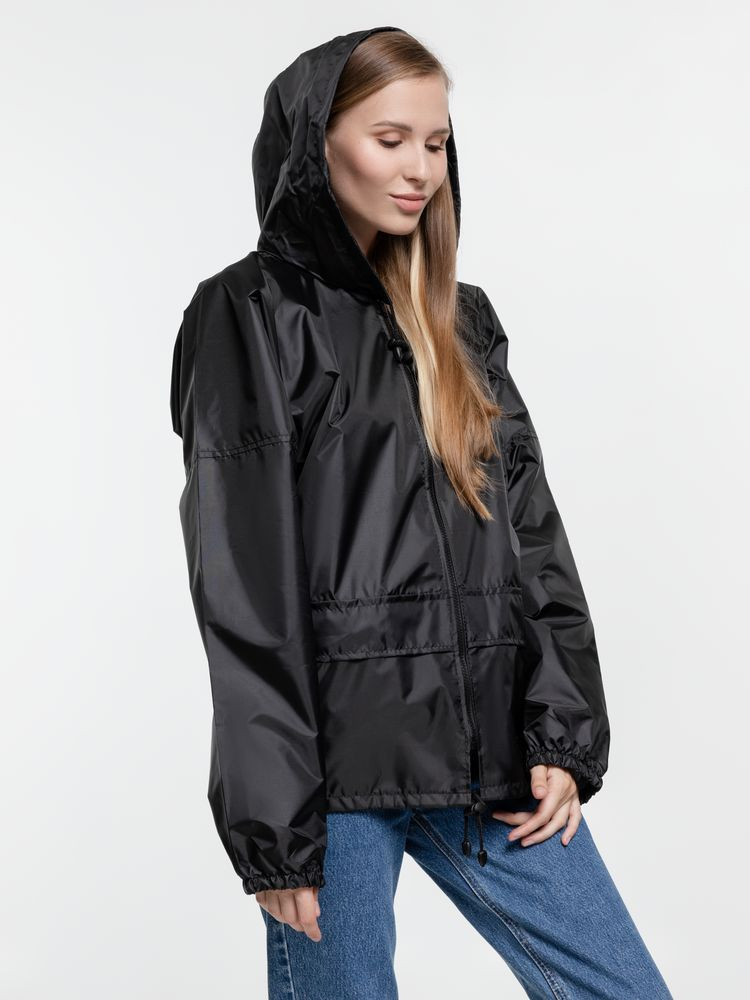 Укороченный дождевик свободного кроя из ткани таффета с влагозащитным покрытием. Складывается в мешочек — удобно брать с собой.