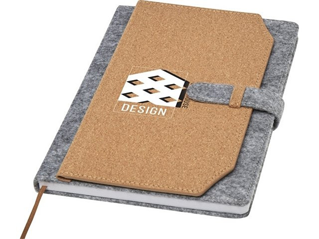 Блокнот формата А5 в твердой обложке из переработанного фетра и пробки, 80 листов бумаги плотностью 70 г/м² в линейку. Блокнот имеет 3 кармана для визиток, коричневую ленту в тон и закругленные углы. FSC certified paper, RPET felt, FSC certified cork. FSC Mix 100% P7.1 CU-COC-877277.