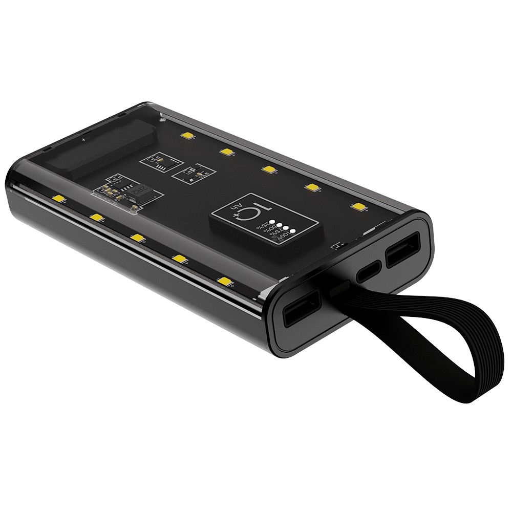 Портативный аккумулятор емкостью 10 000 мАч — это не просто источник энергии, а стильное и футуристичное устройство, которое выделяется своей уникальной конструкцией. Одна часть корпуса выполнена из прозрачного материала, через который прекрасно просматривается современная электронная плата и индикатор заряда батареи, создавая эффект технологичного модуля будущего. Фишкой этого пауэрбанка является встроенная подсветка: при включении он активирует светодиоды, которые мягко светятся через прозрачную крышку, создавая завораживающее световое шоу в нескольких режимах. Это делает устройство не только практичным, но и привлекательным элементом вашего образа, особенно в темное время суток. Дополнительно, силиконовый ремешок обеспечивает надежную защиту и универсальность в использовании — он позволяет носить аккумулятор несколькими способами, будь то в руке, на ремне или в сумке, сохраняя его стильным и удобным в повседневной жизни. Этот аккумулятор станет незаменимым спутником для тех, кто ценит технологичность, эстетичность и функциональность в одном устройстве.