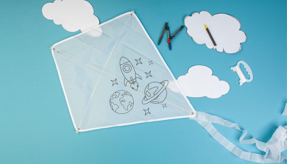 Оригинальная игра-раскраска для детей. Закрасив рисунок - его можно запускать по воздуху, как летучий змей. В комплекте набор с восковыми мелками (синий, зеленый, желтый, красный).