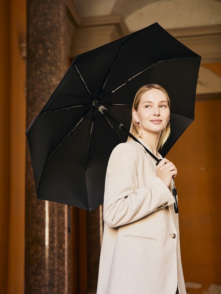 Зонт оборудован электрическим приводом, что позволяет плавно открывать и складывать его без резких рывков, избегая лишних брызг на одежде.